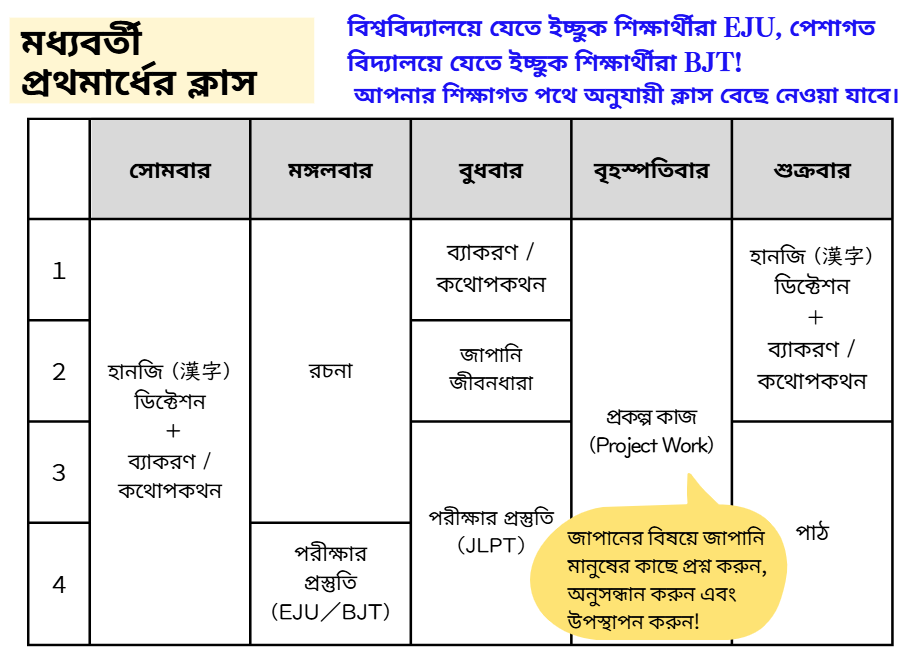 (※ ভর্তি শিক্ষার্থীর জাপানি ভাষার স্তরের উপর নির্ভর করে, সকাল বা বিকেলের ক্লাস নির্ধারিত হবে।)