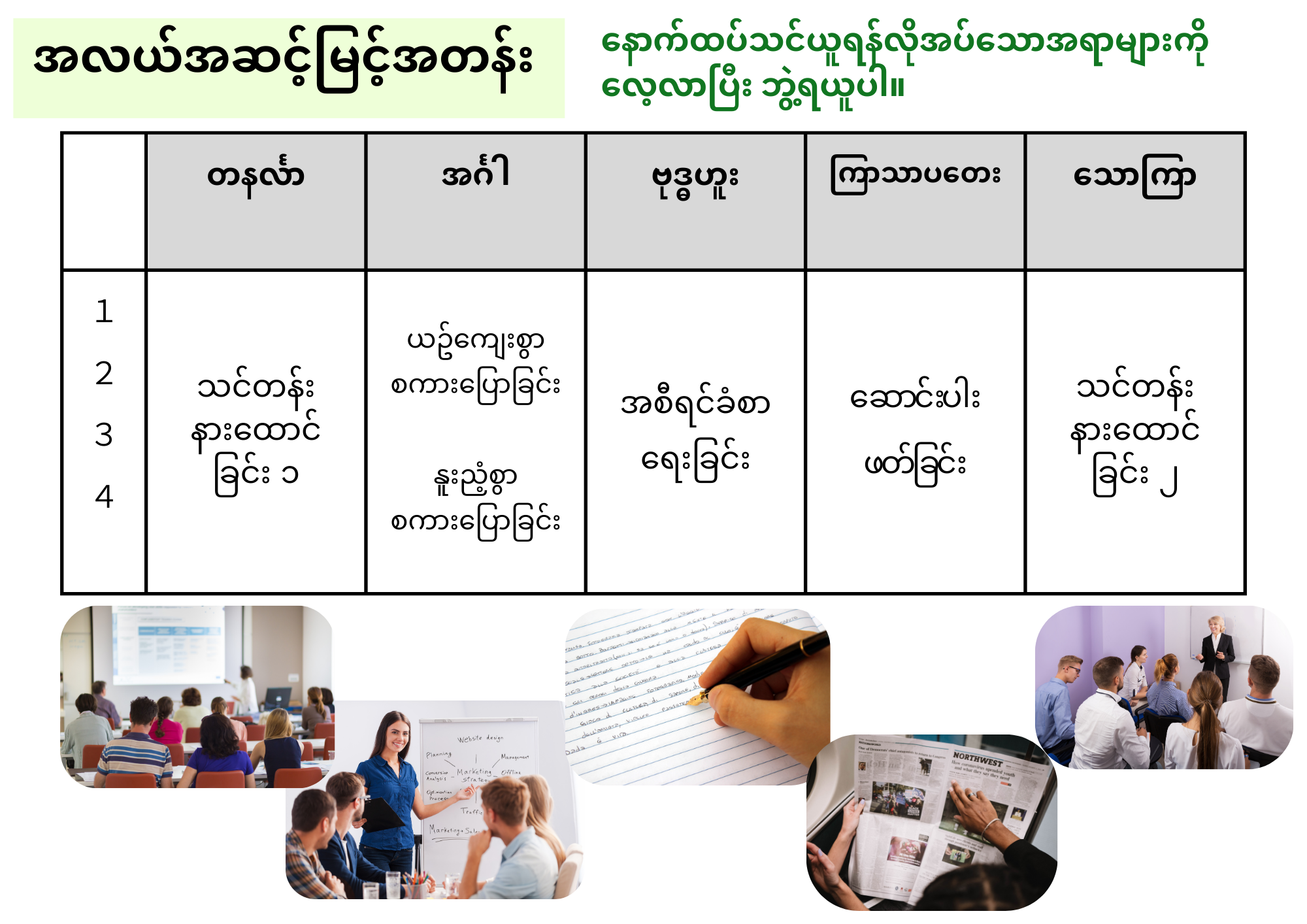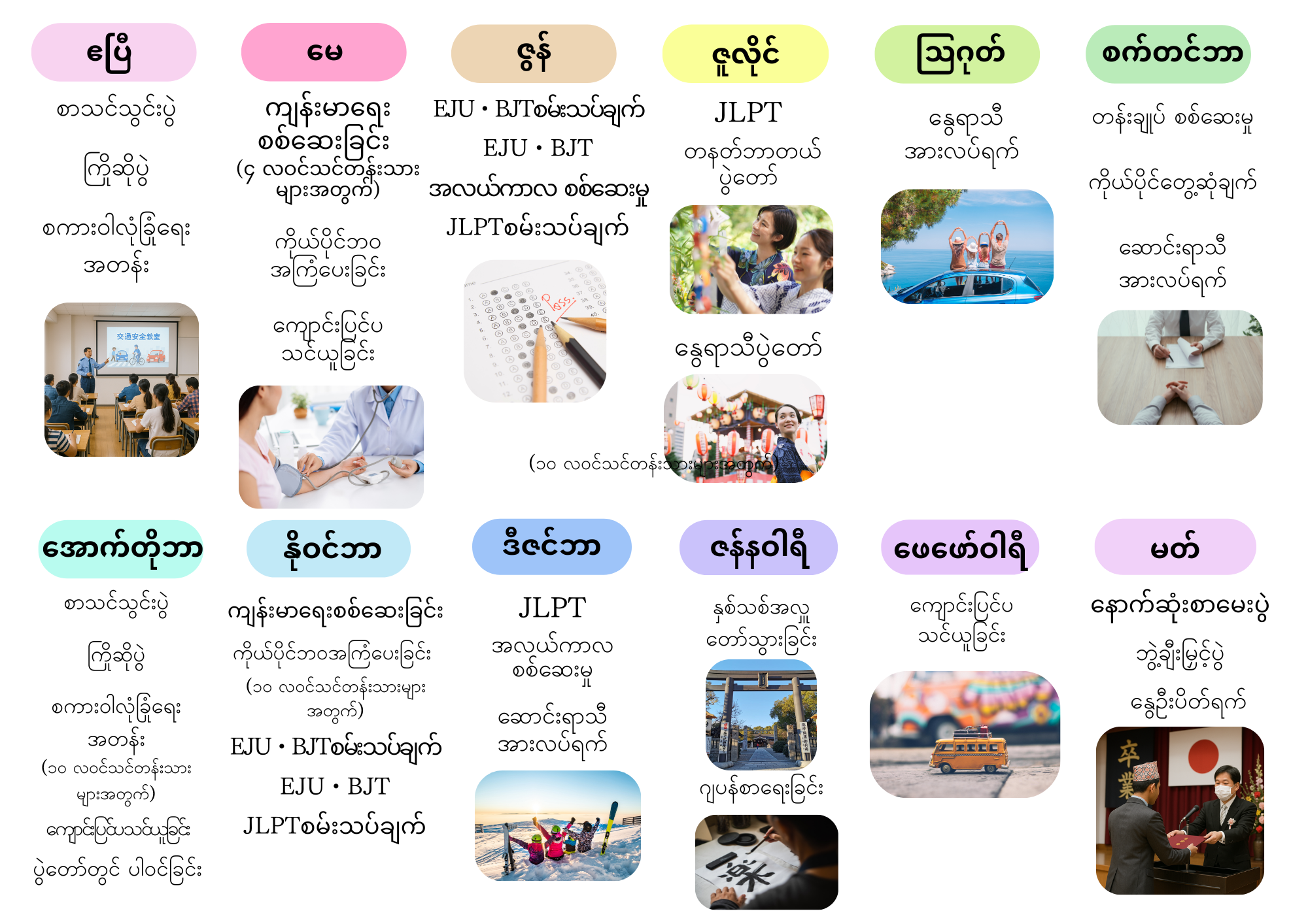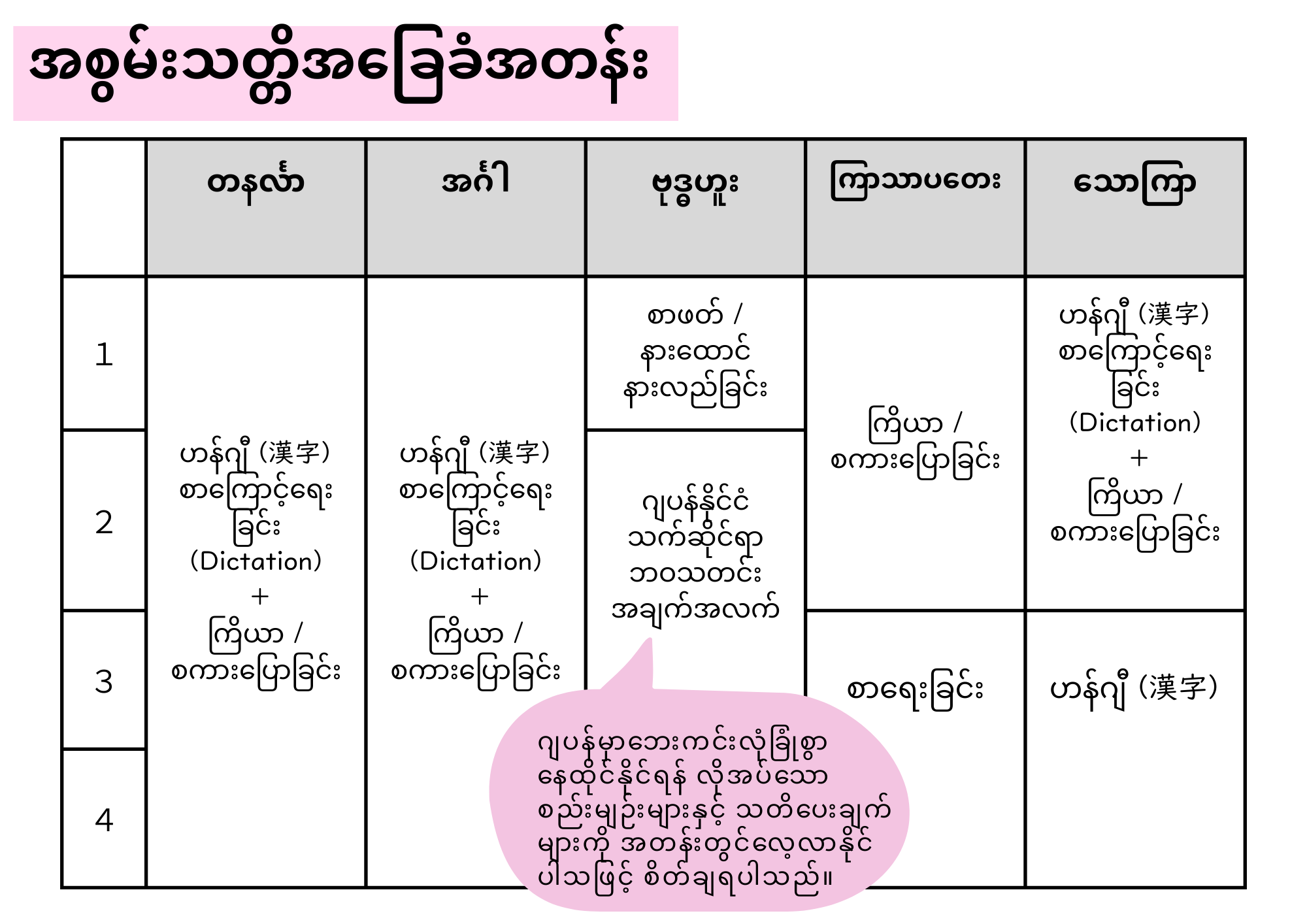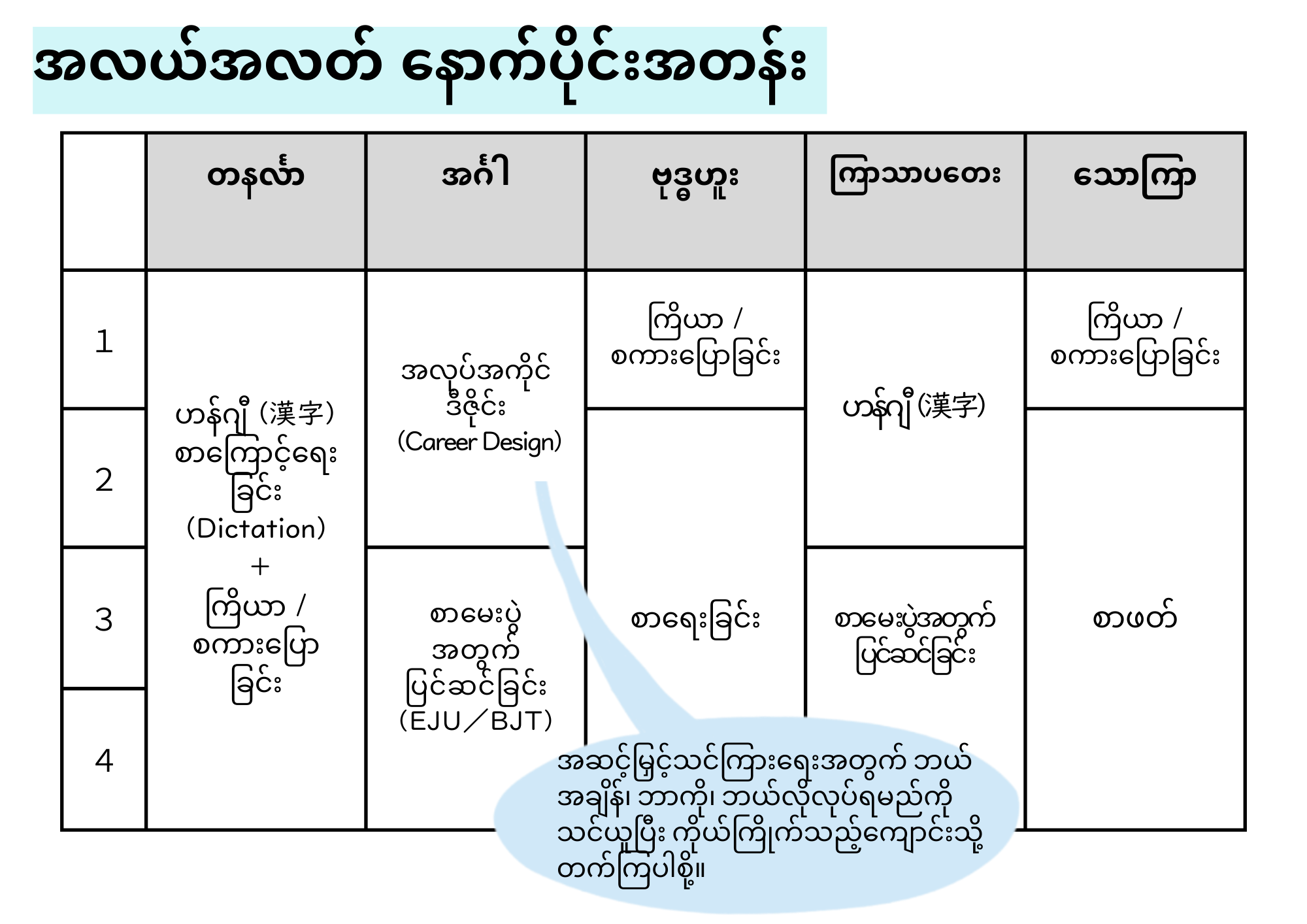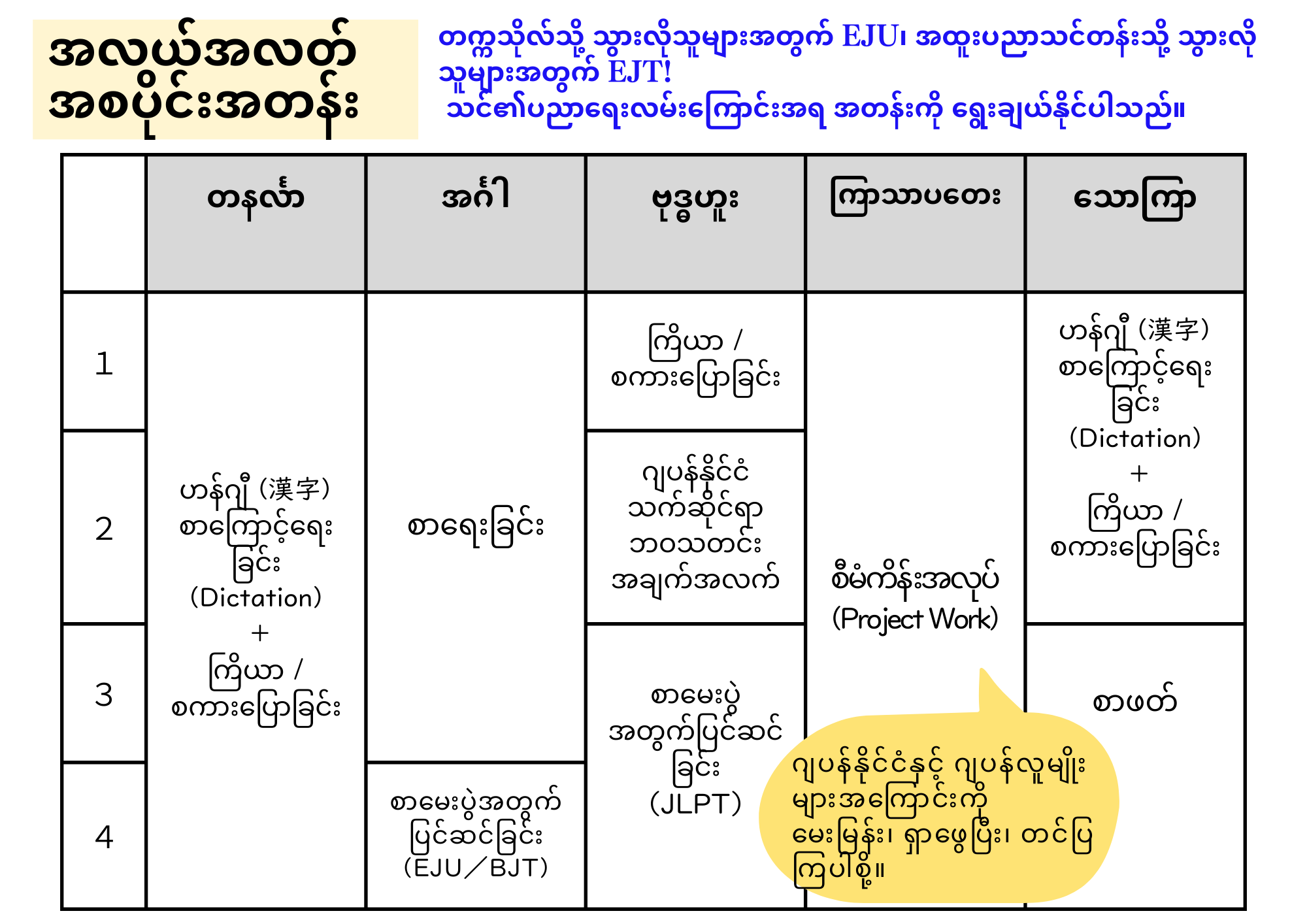 (※ ဝင်ခွင့်ရသည့် ကျောင်းသား၏ ဂျပန်ဘာသာအဆင့်အရ မနက်ပိုင်း သို့မဟုတ် ညနေပိုင်း အတန်းသတ်မှတ်မည်။)