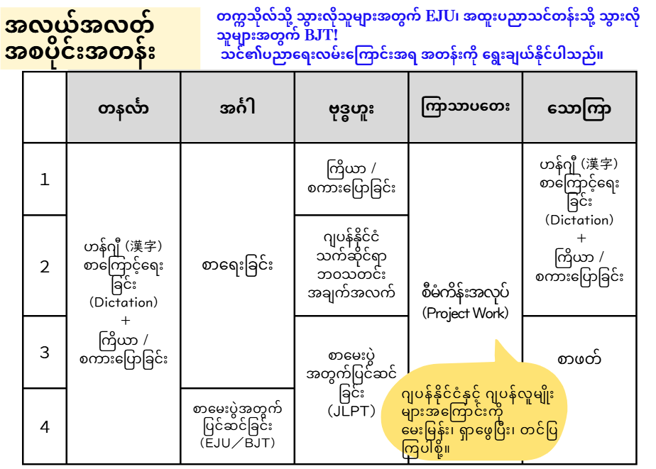 (※ ဝင်ခွင့်ရသည့် ကျောင်းသား၏ ဂျပန်ဘာသာအဆင့်အရ မနက်ပိုင်း သို့မဟုတ် ညနေပိုင်း အတန်းသတ်မှတ်မည်။)