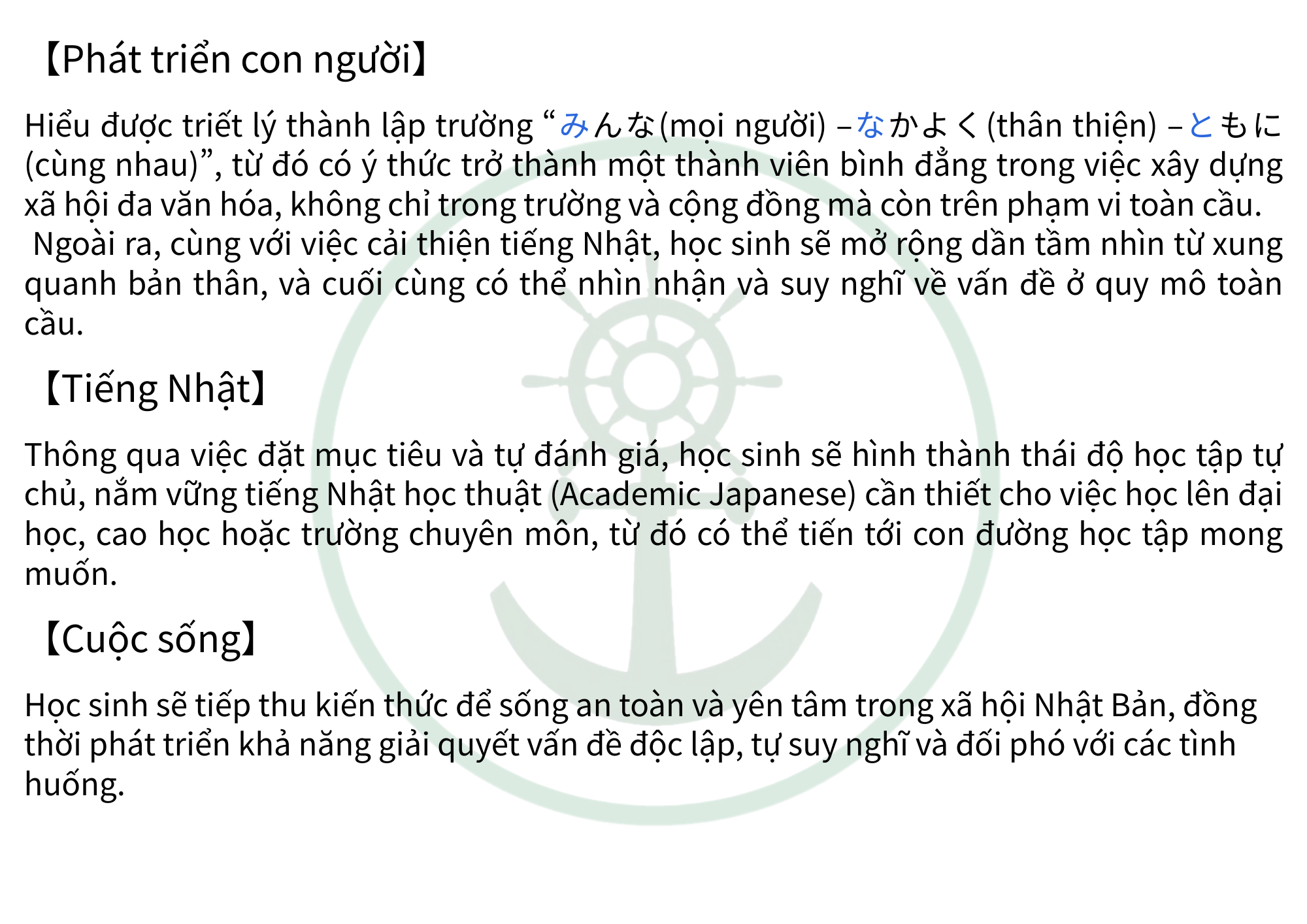Chương trình học không chỉ dạy tiếng Nhật mà còn giúp học viên mở rộng tầm nhìn và phát triển bản thân thông qua việc nâng cao tiếng Nhật.